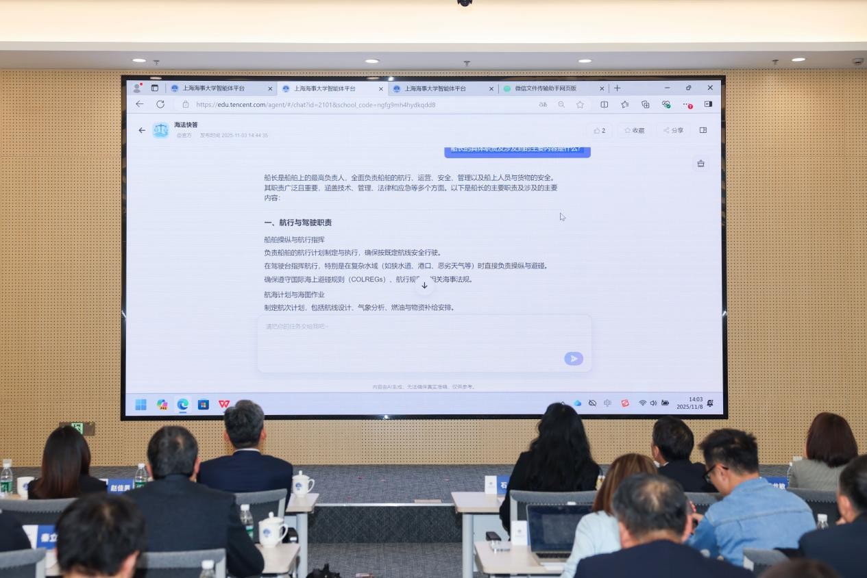 发布会上,发展规划与质量管理处负责人刘涛详细解读了“云端海事大学”的建设构想、整体架构及2025-2030年五年规划。现场演示的“海商法大模型”通过“海法快答”“海法深问”两大模块,直观呈现了在海法教育场景中的差异化功能,赢得现场阵阵掌声。腾讯专家团队还带来“汇智云端,助航海事”“AI技术趋势与应用通识”两场专题宣讲,分别解读“双平台”操作应用与AI前沿成果,为师生提供实操指导与认知拓展。