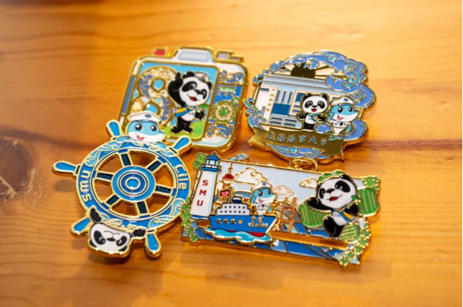 后勤保障方面,学校贴心准备了充满“海味儿”的志愿物资包,成为“小叶子”们的“暖心装备”。实用与颜值兼具的进博主题双肩包,满足服务期间的日常携带需求;印有进博吉祥物“进宝”与海大“小海狮”的可爱颈枕,将展会元素与海事文化巧妙融合,为忙碌中的志愿者提供舒适依靠。尤为亮眼的是“海魂”系列徽章,画有校船“育明轮”的滑动徽章寓意“破浪前行、勇毅探索”,“共掌舵轮”徽章以“进宝”与“小海狮”携手握舵的设计象征“团结协作、共促发展”,“博海情谊”徽章则定格了两者在学校中远图书馆前的同框瞬间,每一件物资都承载着学校的殷切期望,成为“小叶子”们服务期间的精神激励。