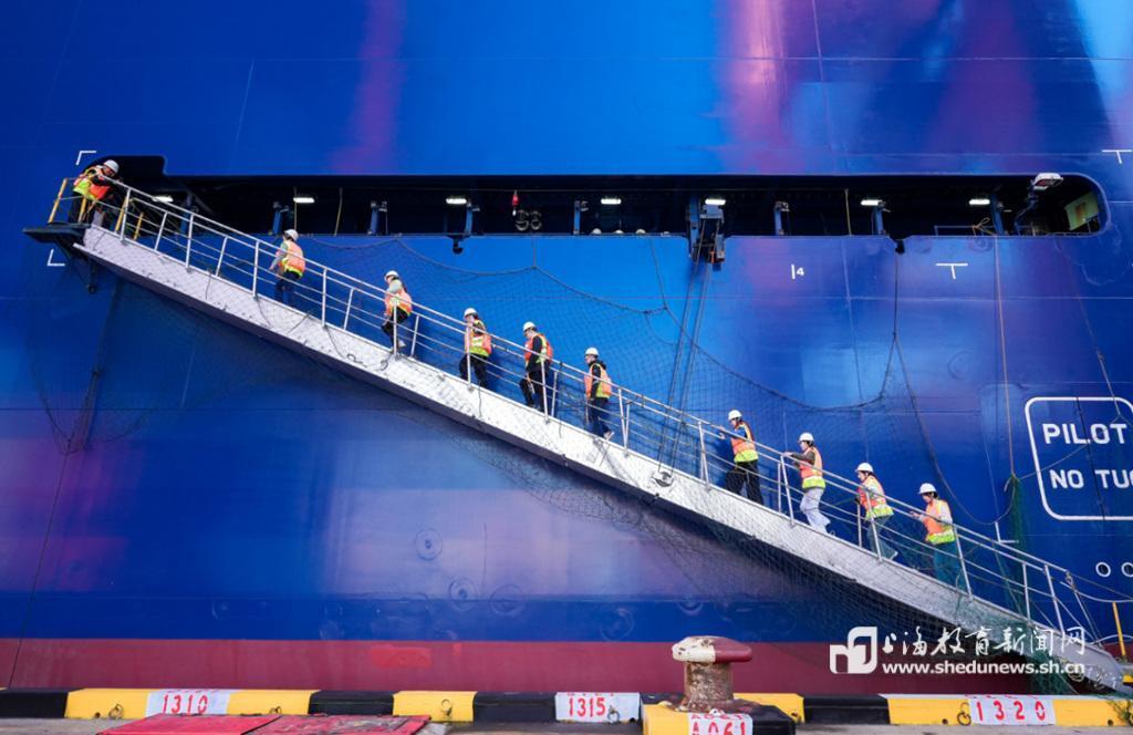 “数百米的船长,上万个集装箱,每一处细节都经过精密规划,只为保障货物运输的安全与高效。这艘集装箱船的规模与复杂程度,着实令我震撼。”近日,上海海事大学2024级交通运输规划与管理专业研究生崔浩淼,在洋山深水港四期登上24000TEU级“现代勒哈弗”号(HMM LE HAVRE)后,发出了这样的感慨。当天,该校交通运输学院组织10名研究生赴洋山港开展航运科考实践活动,学子们登上世界最大集装箱船之一,走访自动化码头,在沉浸式体验中感知航运服务业的发展脉动。