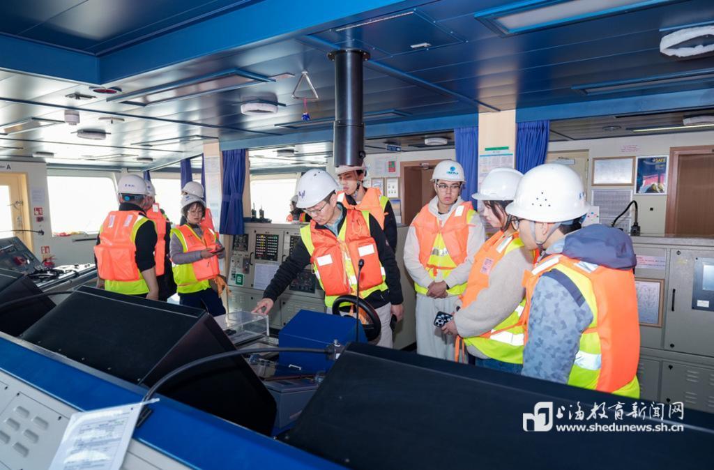 此次研学的核心载体“现代勒哈弗”号,是名副其实的航运“巨无霸”——船长399.9米、宽61.18米、深33.2米,最多可装载23964个标准集装箱。在船方工作人员的带领下,研究生们实地探访了船舶办公室、驾驶台、机舱等核心区域,近距离体验其先进的运营模式与技术细节,对集装箱航运行业的运行机制、船队管理策略以及运营成本优化路径,形成了更为深刻的认知。
