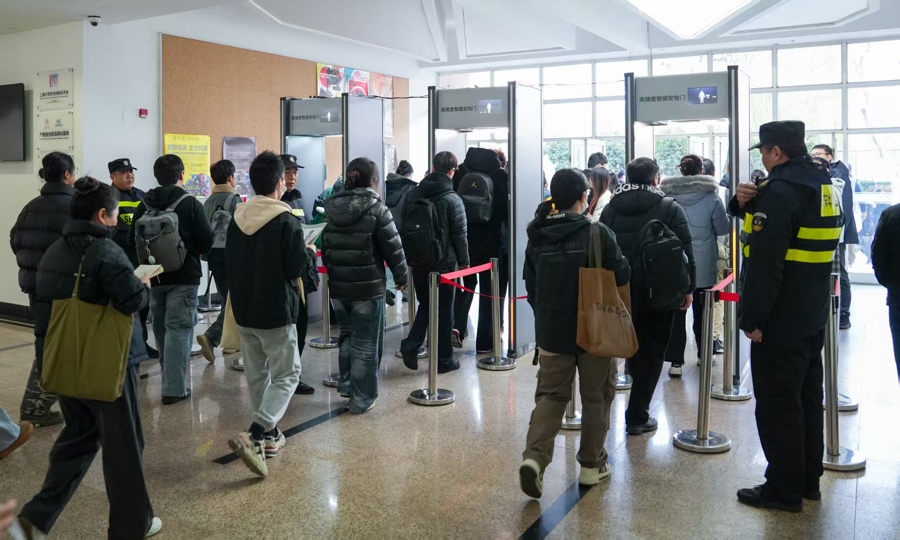 今天,四平路校区、嘉定校区的600余名考务人员早早到岗,为近6000名考生筑牢“平安研考”防线。考场外的“科技助攻”已就位:醒目标识牌引导电子设备存放,智能安检门与人脸识别系统快速核验,二次安检层层把关,让入场环节规范又高效。