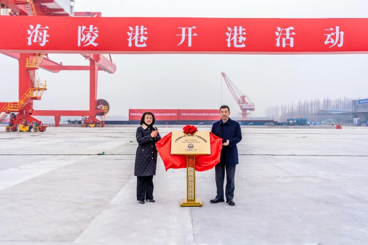 在全场嘉宾的共同见证下,李志鹏与泰州市副市长周小慧共同为“上海海事大学(泰州)产教融合基地”揭牌。