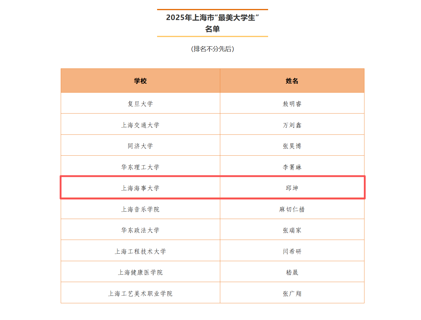 近日,2025年上海市“最美大学生”评选结果正式公布,学校交通运输学院交通工程专业2022级本科生邱坤同学获评该荣誉。该评选旨在表彰专业学习、科研创新、社会服务等方面表现突出、具有示范引领作用的优秀学生典型。