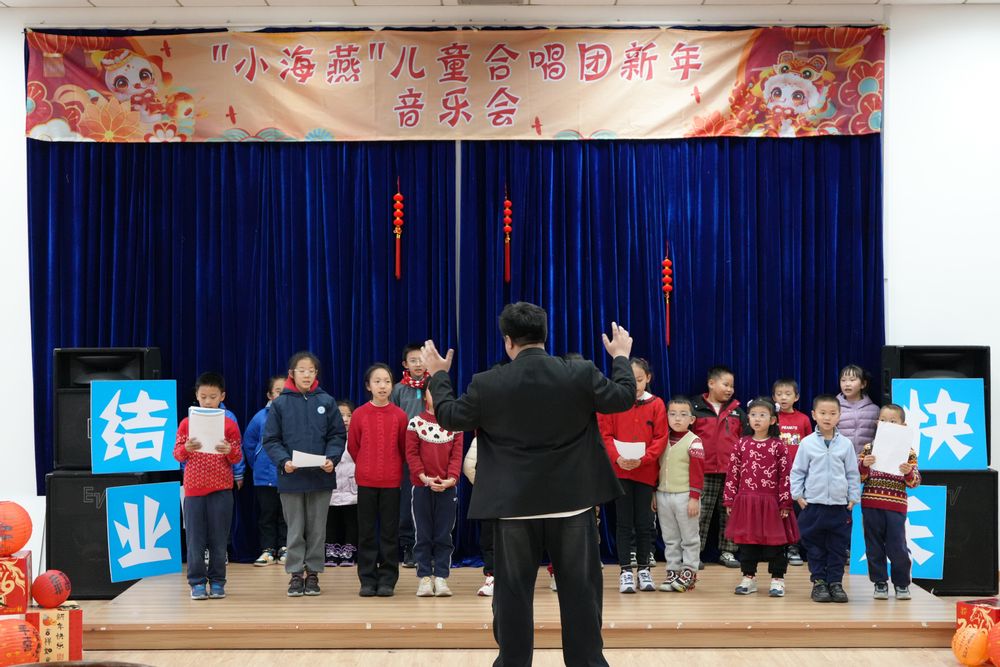 新年音乐会以师生教学互动展示开篇,通过发声练习及分声部合唱等方式,展示了本学期的教学成果。随后,“小海燕”儿童合唱团对《小步舞曲》《新年好》等曲目进行展演,歌声中洋溢着对音乐的热爱与团队合作的快乐,彰显出“小海燕”儿童合唱团的美育成效。