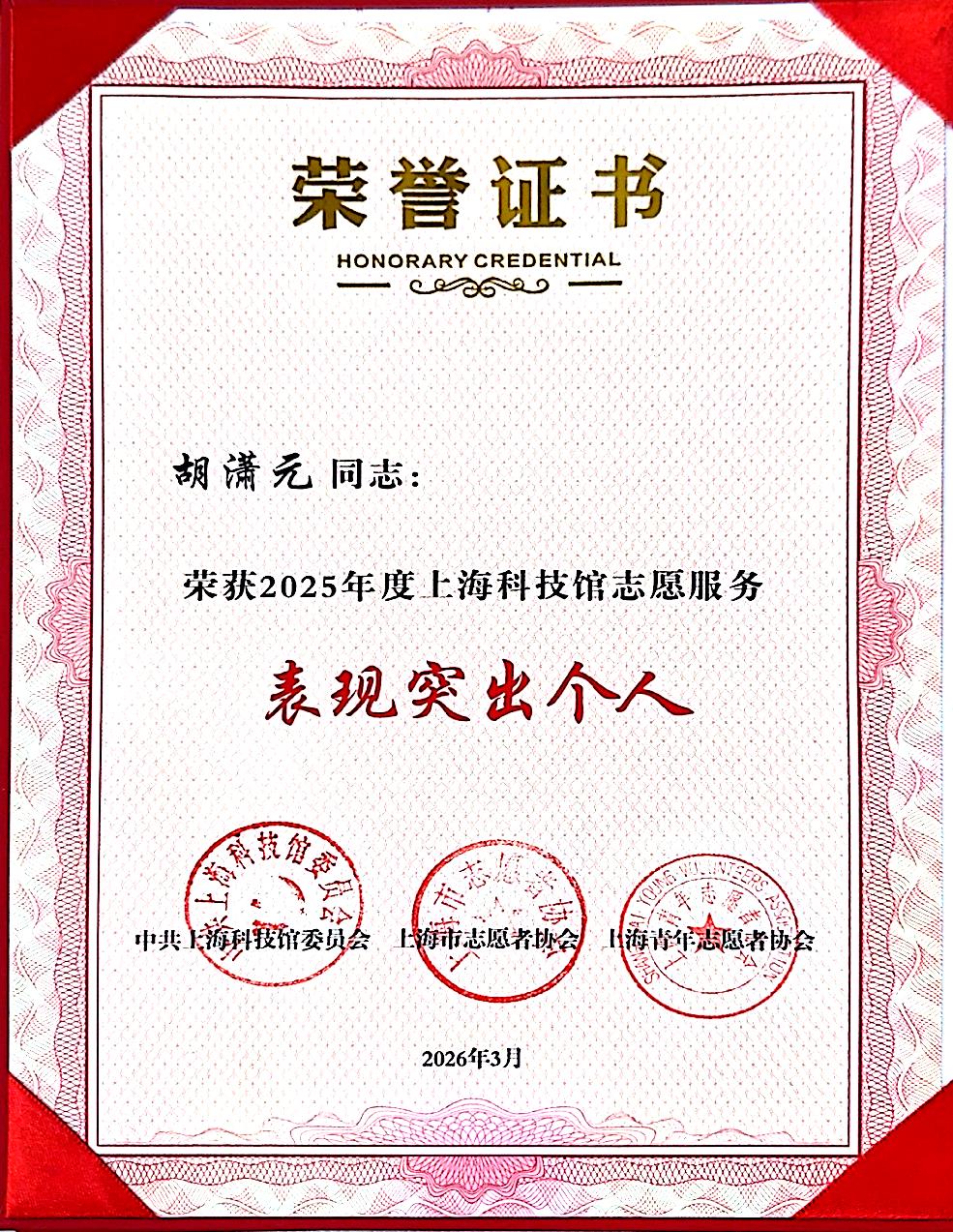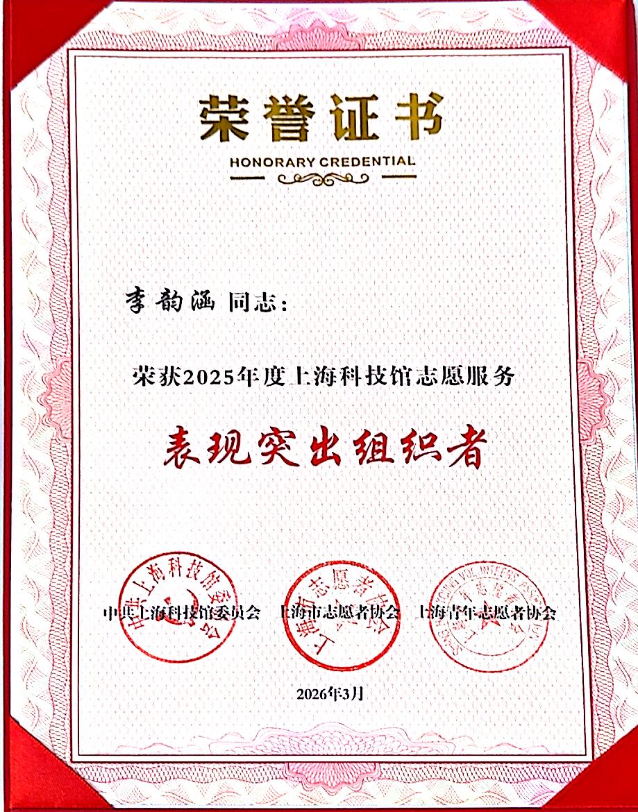 近日,中共上海科技馆委员会、上海市志愿者协会、上海青年志愿者协会联合发布表彰,学校团委获2025年度上海科技馆志愿服务表现突出集体称号,校团委挂职副书记、商船学院辅导员李韵涵获“表现突出组织者”称号,交通运输学院学生志愿者胡潇元、海洋科学与工程学院学生志愿者石镕瑄获“表现突出个人”称号。
